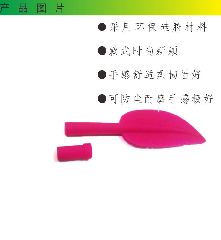 13712483599羽毛形狀硅膠筆套,是硅膠制品中的一種,由東莞帝博硅膠制品廠家創(chuàng)意研發(fā),在筆套內(nèi)套上直徑為6cm左右大的筆芯即可使用,材料選用環(huán)保硅膠高溫成型,無毒無味,產(chǎn)品柔軟有彈性,而且非常的有手感,書寫更華麗。適合很多場合使用,搭配鮮艷的顏色更是讓這款產(chǎn)品如虎添翼,找不出一點瑕疵。